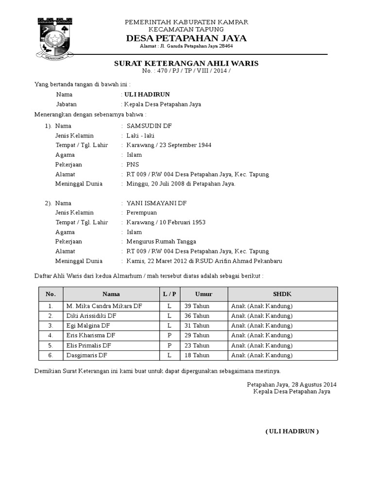 Dan bagaimana cara mengurus surat keterangan ahli waris yang benar? Mengkonsep surat ahli waris dari awal tentu akan menghambiskan waktu sehingga kita perlu menyiapkan file dan dokumen yang dapat dengan mudah kita edit. Surat ini punya kekuatan hukum sebab harus melalui proses persetujuan pejabat pemerintah setempat, misalnya dari kelurahan dan kecamatan atau jasa pejabat pembuat akta tanah. 6.000 dan diketahui serta di tanda tangani oleh para saksi yaitu ketua rt / rw setempat. T menerangkan bahwa dengan sesungguhnya bahwa almarhum ismail. Mempunyai dokumen surat keterangan dan pernyataan ahli waris memiliki peranan yang sangat penting, karena keberadaannya dapat membuat seseorang memiliki keabsahan secara hukum surat kematian pewaris/orang tua dari kelurahan. Contoh surat keterangan ahli waris dari kecamatan. Demikian surat pernyataan pembagian waris ini kami buat dengan sebenarnya (jika diperlukan sanggup diangkat sumpah) dan dipergunakan untuk melengkapi surat pernyataan yang bersangkutan guna mengajukan permohonan. Surat kuasa ahli waris ini berbeda dengan surat jual beli pada umumnya. Setelah itu selesai, anda dapat mendatangi kecamatan atau kelurahan daerah tempat tinggal dan juga memberikan contoh surat pernyataan. Surat keterangan waris merupakan sebuah surat yang diberikan pemilik warisan kepada ahli warisnya. Nantinya proses akan dilanjutkan ke tingkat kelurahan dan kecamatan. Itulah sebabnya saya coba posting contoh surat keterangan ahli waris ini, semoga saja dapat membantu yang membutuhkannya.